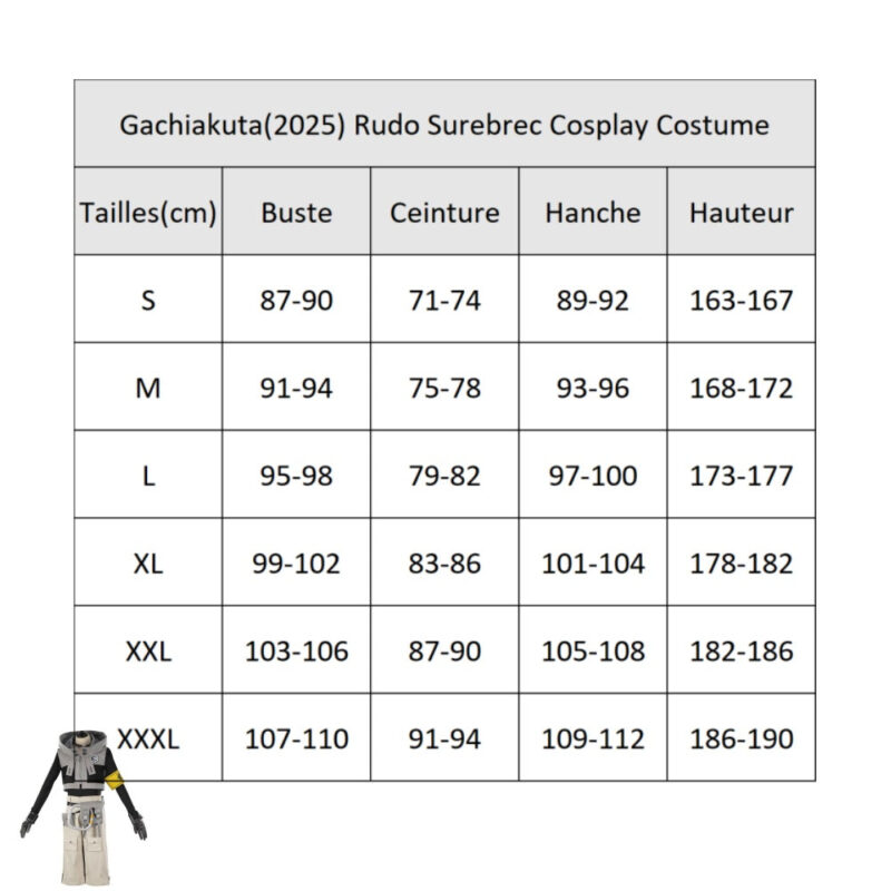 Disponible en plusieurs tailles : L, M, S, XL, Nul, XXL. Consultez le guide des tailles avant de commander. Contenu : costume principal, accessoires assortis.