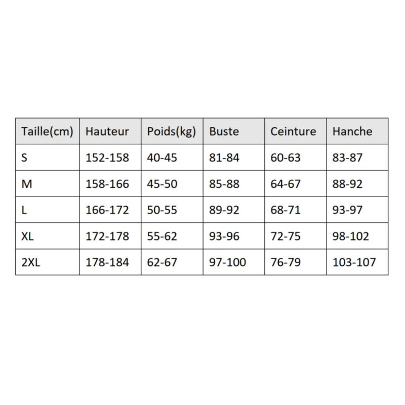 Tailles proposées : L, M, S, XL, XXL. Référez-vous à nos mensurations pour un ajustement optimal.