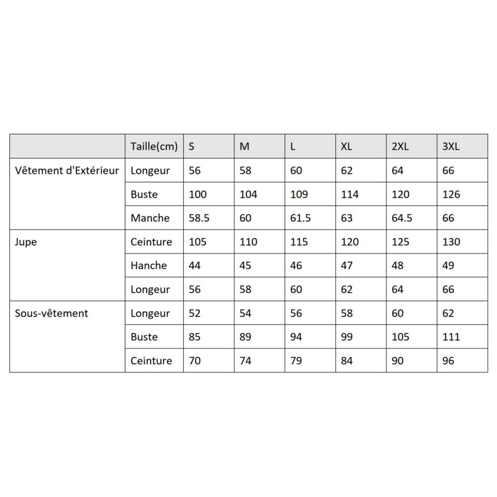 Choisissez votre taille parmi L, M, S, XL, XXL, XXXL. Un guide des tailles est disponible pour vous orienter. Composition du pack : tenue complète, finitions détaillées.
