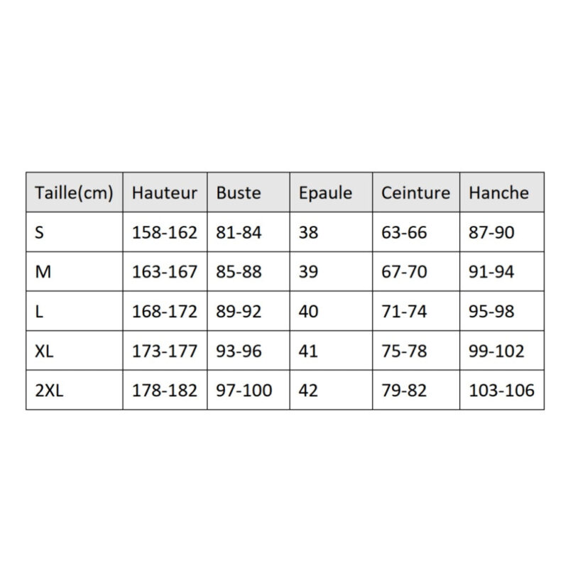 Tailles proposées : L, M, S, XL, XXL. Référez-vous à nos mensurations pour un ajustement optimal.