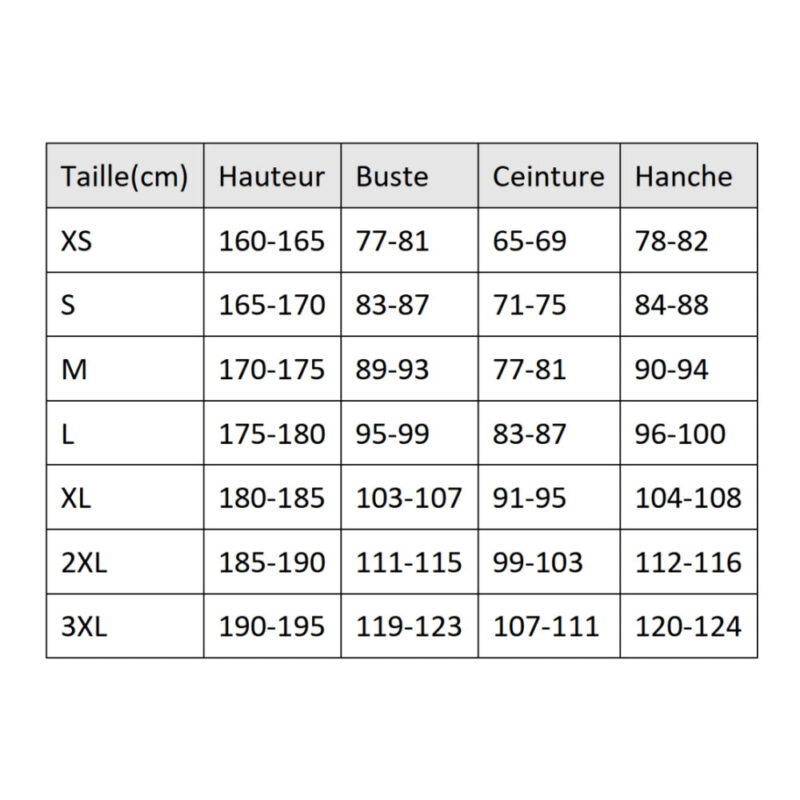 Choisissez votre taille parmi L, M, S, XL, XS, XXL. Un guide des tailles est disponible pour vous orienter.