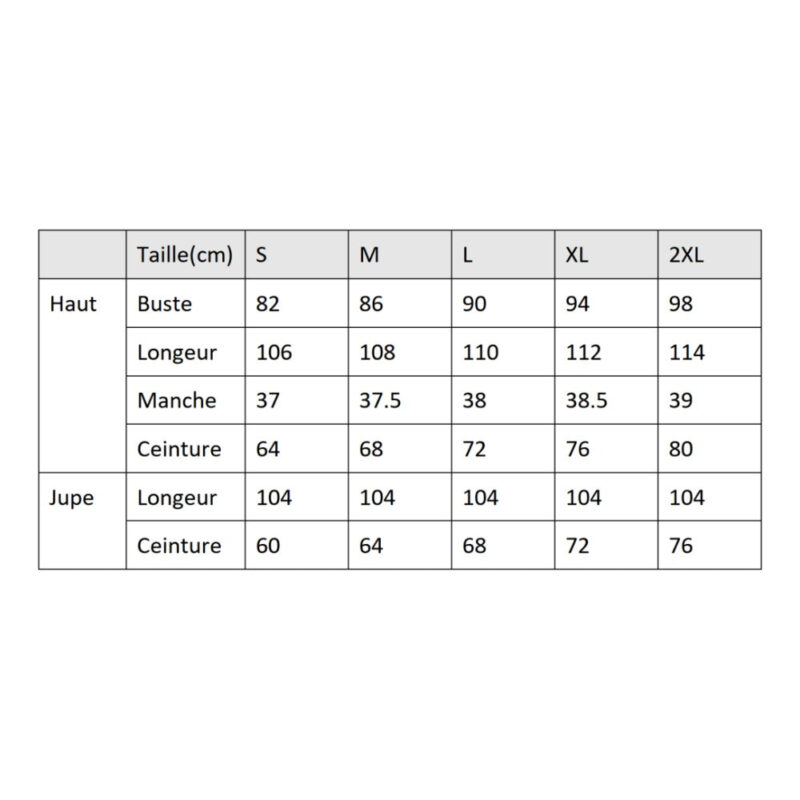 Tailles proposées : L, M, S, XL, XXL. Référez-vous à nos mensurations pour un ajustement optimal. Le kit comprend : tenue complète, finitions détaillées.