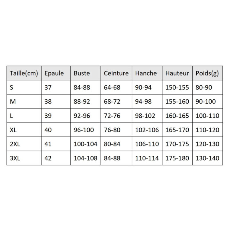 Choisissez votre taille parmi L, M, S, XL, XXL, XXXL. Un guide des tailles est disponible pour vous orienter. Vous recevrez : costume principal, accessoires assortis.