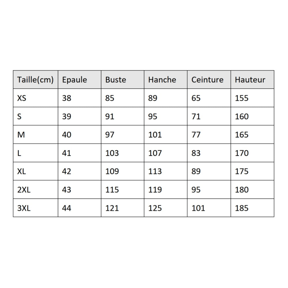 Tailles proposées : L, M, S, XL, XS, XXL. Référez-vous à nos mensurations pour un ajustement optimal. Vous recevrez : pièce principale, ornements caractéristiques.