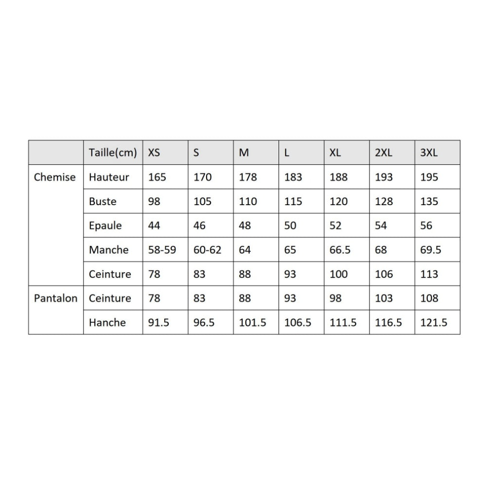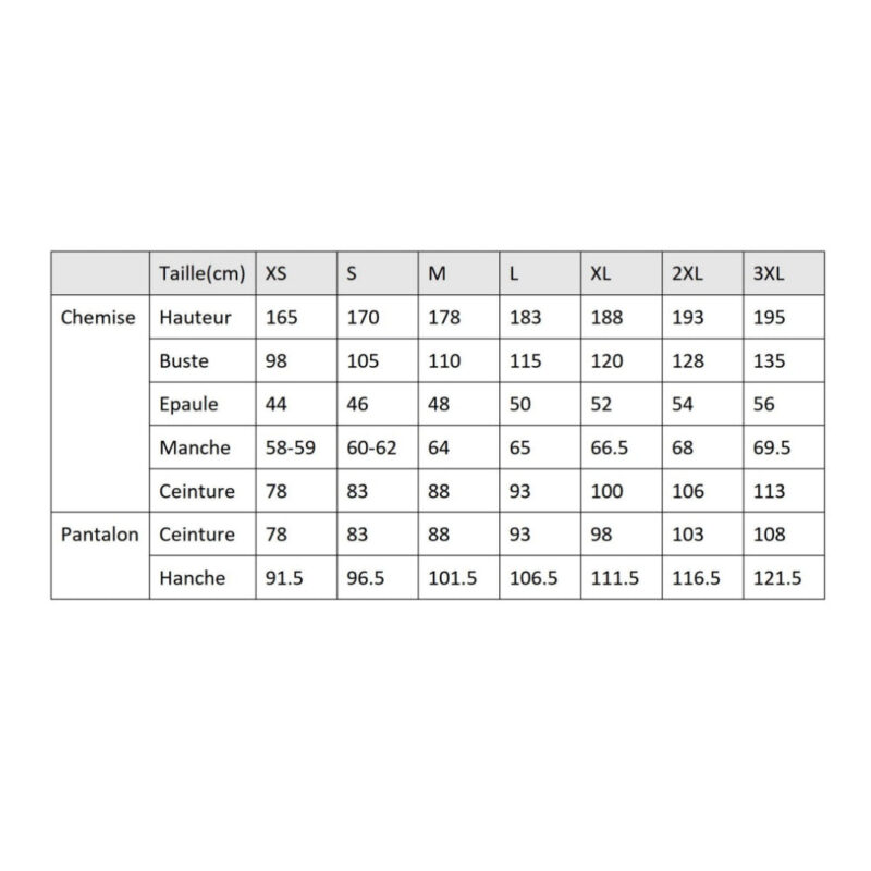 Tailles proposées : L, M, S, XL, XS, XXL. Référez-vous à nos mensurations pour un ajustement optimal. Vous recevrez : costume principal, accessoires assortis.